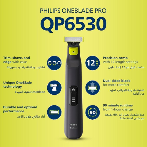 ماشین اصلاح وان بلید پرو (One Blade Pro) فیلیپس با فن آوری انقلابی خود قادر به اصلاح صورت می باشد. این دستگاه قادر به کوتاه کردن، خط گیری و تراشیدن هر مویی با هر اندازه ای می باشد. فن آوری دوگانه مراقبت از پوست دستگاه شامل یک لایه پوشش روی تیغه ها به همراه لبه های گرد آن ها می باشد که مانع از هر گونه آسیب رسیدن به پوست می شوند. تیغه دستگاه با سرعت 200 جابه جایی در هر ثانیه به طرز موثری تمامی موها را اصلاح می کند.دارای طراحی ارگونومی و همچنین ضد آب بودن آن قابلیت استفاده به صورت خشک و مرطوب و نظافت آسان دستگاه رو ارائه می دهد. دارای شانه اصلاح مدرج با 12 درجه تنظیم از 0.5 تا 9 میلی متر . امکان اصلاح ریش و سبیل با 12 درجه مختلف از اصلاح بسیار کوتاه تا ته ریش و یا ریش با اندازه های مختلف. 1 ساعت شارژ برای 90 دقیقه استفاده . نشانگر باتری زمانی که باتری شما کم است به شما هشدار می دهد و در صورت اتصال به برق پیشرفت شارژ را نشان می دهد.