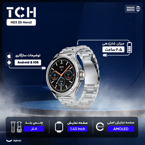 برخی از افراد به ساعت‌های کلاسیک علاقه دارند و ظاهر اسپرت ساعت‌های هوشمند باعث می‌شود تا سراغ این محصولات نروند. TCH به فکر این افراد هم بوده و با تولید ساعت هوشمند HD2 3D Hero2 که طراحی کلاسیک دارد، تلاش می‌کند تا طرفداران این ساعت‌ها را به خود جذب کند. ساعت هوشمند TCH HD2 از صفحه نمایش 1.43 اینچی امولد با رزولوشن 466×466 استفاده می‌کند. این صفحه نمایش، محتوا را با کیفیت بالایی نمایش می‌دهد و می‌توانید آن را در زیر نور خورشید به خوبی ببینید. جنس بدنه این ساعت از جنس آلیاژ روی است. جالب است بدانید که روی به تعادل آنزیم‌های بدن کمک می‌کند. همچنین، در کنار بند فلزی، یک بند چرمی نیز داخل جعبه موجود است و این امکان را دارید تا بنا به سلیقه خود یکی از بندها را روی ساعت ببندید. این ساعت از بند 22 میلی‌متری استفاده می‌کند و می‌توانید به راحتی بندهای مورد علاقه خود را با نمونه‌های اصلی تعویض کنید. ساعت هوشمند TCH HD2 مجموعه کاملی از قابلیت‌های سلامتی را در خود جای داده است. از جمله عملکردهای سلامتی این ساعت می‌توان به پایش قدم‌ها و مسافت طی شده، سنجش کالری مصرف شده، ضربان قلب، اکسیژن خون و مانیتورینگ خواب اشاره کرد. همچنین، بیش از 160 حالت ورزشی برای این ساعت در نظر گرفته شده و تقریبا می‌توان اطلاعات هر ورزشی را با این ساعت ردیابی کرد و سنجید. گواهی IP68 نیز تضمین می‌کند که در هیچ شرایطی آب و گردوغبار به درون ساعت نفوذ نکند. TCH HD2 3D Hero2 به طور کامل از زبان فارسی پشتیبانی می‌کند و می‌توانید علاوه بر تغییر زبان ساعت به فارسی، نوتفیکیشن‌های فارسی را نیز دریافت کنید. این قابلیت حتی در برخی از ساعت‌های گران‌قیمت‌تر بازار نیز دیده نمی‌شود. همچنین می‌توانید ساعت را هم به گوشی‌های اندرویدی و هم آیفون متصل کنید. درون این ساعت جدید TCH یک باتری 300 میلی‌آمپر ساعتی تعبیه شده که عمر باتری بیش از 7 روز را برای شما به ارمغان می‌آورد و پس از پایان باتری نیز می‌توانید آن را در مدت 2.5 ساعت به طور کامل شارژ کنید. امکان برقراری و پاسخ به تماس نیز از دیگر قابلیت‌های جذاب HD2 است و می‌توانید علاوه بر پاسخ به تماس‌های دریافتی، به صورت مستقیم از ساعت با دیگران تماس بگیرید.