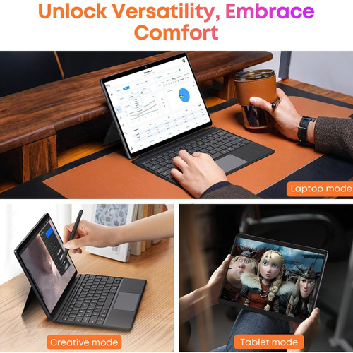 تبلت 12.96 اینچی چووی مدل Hi10 Max N150 یک دستگاه هیبریدی قدرتمند است که با ترکیب قابلیتهای تبلت و لپتاپ، برای کاربریهای اداری، آموزشی و نیمهحرفهای طراحی شده است. طراحی باریک با ابعاد 278.89×192.39×2.35 میلیمتر و وزن 780 گرم در کنار بدنه فلزی، این دستگاه را به گزینهای مناسب برای حمل روزانه و استفاده در محیطهای کاری و دانشگاهی تبدیل میکند. قاب جلویی شیشهای و فریم و پشت آلومینیومی، حس استحکام و کیفیت ساخت بالا را بهخوبی منتقل میکند. صفحهنمایش 12.96 اینچی IPS این مدل با رزولوشن 2880×1920 پیکسل و نسبت تصویر 3:2، فضای کاری گسترده و وضوح بالایی را ارائه میدهد. روشنایی 400 نیت باعث میشود محتوا حتی در محیطهای پرنور نیز خوانا باشد. این نمایشگر برای مطالعه طولانیمدت، کار با اسناد، طراحی و تماشای محتوای چندرسانهای کاملاً مناسب است و قابلیت تقسیم صفحه در ویندوز 11 بهرهوری کاربر را افزایش میدهد. در بخش سختافزار، چووی Hi10 Max N150 به پردازنده Intel N150 از نسل Twin Lake مجهز شده که دارای 4 هسته و 4 رشته با فرکانس حداکثر 3.6 گیگاهرتز است. در کنار آن، 12 گیگابایت رم LPDDR5 و حافظه داخلی 512 گیگابایت SSD، اجرای روان سیستمعامل Windows 11، نرمافزارهای آفیس، وبگردی سنگین و چندوظیفگی را تضمین میکنند. نبود شیار کارت حافظه با توجه به ظرفیت بالای حافظه داخلی، مشکل خاصی ایجاد نمیکند. این تبلت از نظر ارتباطی نیز کامل است و با پشتیبانی از Wi‑Fi 6، بلوتوث 5.2 و دو پورت USB Type‑C 3.0 با قابلیت Thunderbolt 3، اتصال سریع به تجهیزات جانبی، مانیتور و حافظههای اکسترنال را ممکن میسازد. پورت USB Type‑C وظیفه شارژ دستگاه را نیز بر عهده دارد. در بخش دوربین، یک سنسور 8 مگاپیکسلی با فوکوس خودکار در پشت و دوربین سلفی 5 مگاپیکسلی برای تماسهای ویدیویی در نظر گرفته شده است. باتری 4800 میلیآمپرساعتی نیز تا حدود 4.5 ساعت استفاده معمول را پاسخ میدهد. پشتیبانی از کیبورد و قلم، تبلت چووی Hi10 Max N150 را به انتخابی منطقی برای کاربرانی تبدیل میکند که به دنبال یک تبلت ویندوزی کامل و کاربردی هستند.