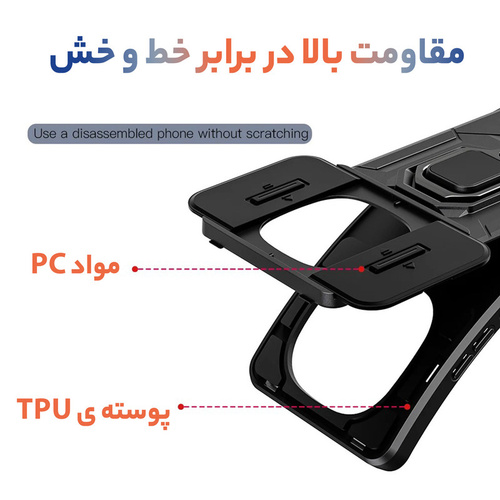 کاور جدید سامورایی سری Shockproof به گونه ای طراحی شده است که همه لبه های آن، با ارتفاع قابل توجهی گوشی را در بر گرفته و مانع از آسیب دیدن گوشی شیائومی Redmi Note 14 Pro 4G شود. گرچه این قاب با لبه های ژله ای هر چهار طرف گوشی را پوشانده است، اما به دلیل انعطاف پذیری لبه ها، کاربران برای نصب و جداسازی این قاب روی گوشی زحمتی نخواهند داشت و فشاری به گوشی وارد نمی شود. ژله ای بودن دور کاور باعث میشد در صورت سقوط گوشی روی زمین شوک ناشی از ضربه در همه زوایای کاور پخش شده و آسیبی به گوشی وارد نشود. یکی از مهمترین ویژگی های این قاب وجود حلقه نگهدارنده در پشت قاب است که شما میتوانید از حلقه ای که به این قاب متصل است در موارد گوناگون استفاده کنید. برای نمونه: با قرار دادن انگشت دورن حلقه، گوشی Xiaomi Redmi Note 14 Pro 4G کاملا در دست محکم می شود و احتمال افتادن گوشی از دست از بین میبرد. یا میتوانید با چرخاندن حلقه کاور را به حالت استند در بیاورید و به تماشای فیلم بپردازید. همچنین این حلقه نگهدارنده با داشتن حالت آهن ربایی می تواند به خوبی روی هولدرهای آهنربایی داخل خودرو بچسبد و دیگر نیازی به استفاده از برچسبهای آهن ربایی مجزا نخواهید داشت. این قاب دارای یک اسلاید کشویی است که به خوبی از دوربین محافظت می کند. همچنین در اطراف لنز های دوربین مقداری برجستگی وجود دارد که می تواند از دوربین گوشی هنگام ضربه محافظت کند. صنایع دستی دیجی پارس