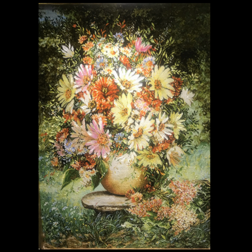 تابلوفرش دستبافت تبریز گل گلدانی ومنظره ارتفاعی زمینه کرک وابریشم چله ابریشم 70رج باقاب نفیس چوبی