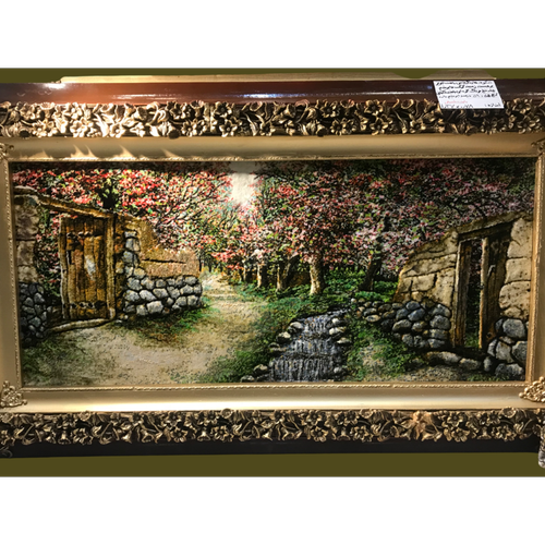 تابلوفرش دستبافت تبریز منظره کوچه باغ برجسته زمینه کرک وابریشم چله ابریشم 70رج باقاب نفیس چوبی گل باران