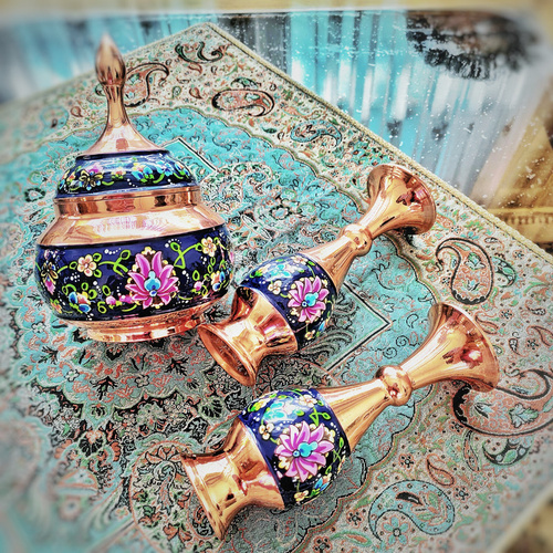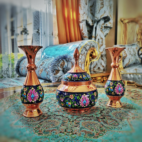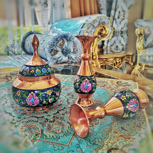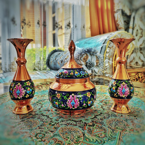 این ست شکلات خوری و گلدان مس و پرداز، هر چشمی را به خود خیره میکند و جلوه هر خانه و کاشانه ای را صد چندان. این ست شکلات خوری و گلدان هدیه ای بی نظیر برای عزیزان و دوستانتان در مناسبت های مختلف است.بر روی زمینه مِسی، پردازهایی زیبا و هنرمندانه به رنگ های آبی، قرمز، نارجی و سفید نقاشی شده است که زیبایی این محصول را دوچندان کرده است. این ست مس و پرداز به سبک جدیدی توسط هنر دست نگارگران و نقاشان طراحی و ساخته شده است.ترکیب فوق العاده رنگ مِسی با رنگ سورمه ای، تعادل رنگی و فرمی این محصولِ زیبا را تداعی می کنند. این محصول می تواند به عنصر کانونی در قلب دکوراسیون داخلی خانه های سنتی و مدرن در نظر گرفته شود.