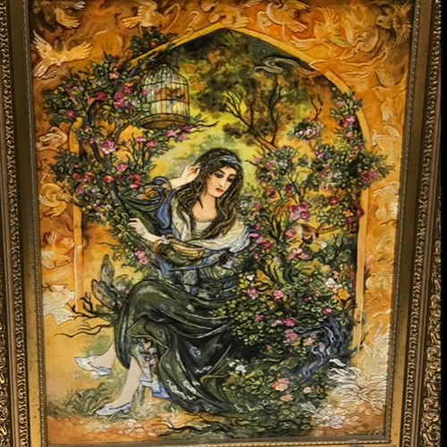 تابلوفرش دستبافت تبریز مینیاتور اسم تابلو قفس زمینه کرک وابریشم برجسته چله ابریشم 70رج باقاب پی وی سی