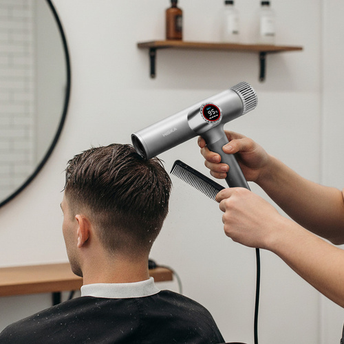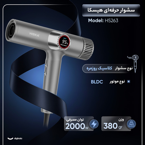 سشوار مدل H5263 از برند هیسکا ترکیبی از قدرت، هوشمندی و طراحی نوآورانه است و برای استفاده روزمره یا حرفهای ایدهآل است. این دستگاه با توان 2000 وات و موتور پرقدرت BLDC با سرعت 110 هزار دور در دقیقه، هوای یکنواخت و پرفشار تولید میکند تا موها در کمترین زمان خشک شده و از آنها مراقبت شود. نمایشگر گرد LCD ظاهر مدرن و کاربری آسانی به دستگاه بخشیده است. امکان تغییر دما از سرد به گرم تنها با یک دکمه و وجود 9 حالت کاری شامل سه سطح دما (سرد، گرم، داغ) و سه سطح سرعت (کم، متوسط، زیاد) تجربه استفاده را انعطافپذیر میکند. حالت گردش خودکار دمای هوا بر اساس کیفیت مو و پوست سر، عملکرد هوشمندانه دستگاه در مراقبت از مو را افزایش میدهد. عملکرد خاموشی خودکار پس از 10 ثانیه و قابلیت پاکسازی خودکار توری ورودی هوا ایمنی و نگهداری دستگاه را ارتقاء میدهد. فناوری تنظیم دمای هوشمند از آسیب مو جلوگیری میکند و طراحی کاهش نویز، صدای تولیدی را در سطح مطلوب نگه میدارد. فناوری یونی قدرتمند با تولید 600 میلیون یون منفی در هر سانتیمتر مکعب، از ایجاد الکتریسیته ساکن جلوگیری کرده و نرمی، لطافت و درخشندگی طبیعی موها را حفظ میکند. ورودی هوای روی دسته مانع مکش تصادفی مو میشود و نازل و دیفیوزر مغناطیسی تنوع حالتدهی و راحتی استفاده را افزایش میدهند. سشوار با طول کابل 3 متری آزادی حرکت خوبی فراهم میکند و بدنه مقاوم از جنس پلاستیک PC با وزن سبک 380 گرم، استفاده طولانیمدت را بدون خستگی امکانپذیر میسازد. در مجموع، هیسکا مدل H5263 ترکیبی از قدرت صنعتی، دقت دیجیتال و مراقبت هوشمند از مو است و هم برای نیازهای روزمره و هم استفاده حرفهای در آرایشگاهها مناسب است.