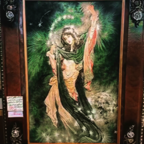 تابلوفرش دستبافت تبریز مینیاتور طرح ستاره صبحگاهی برجسته زمینه کرک وابریشم چله ابریشم استادبافت رج70 باقاب چوبی براق شیک