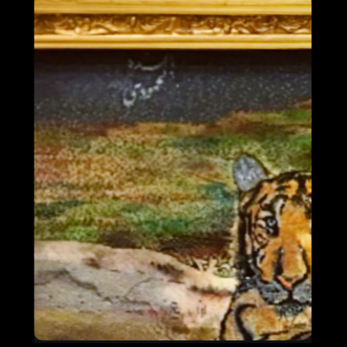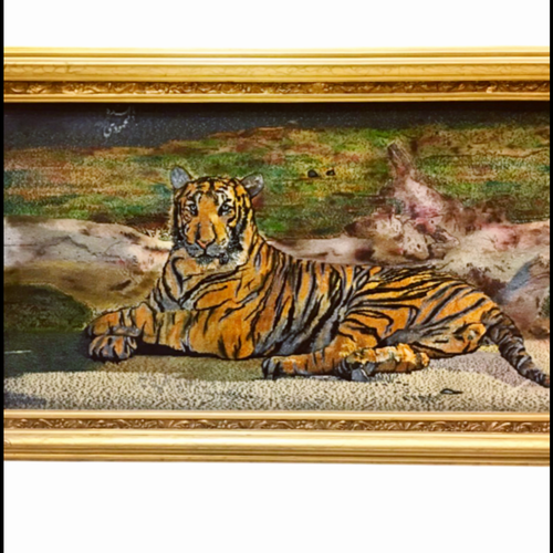 تابلوفرش دستبافت تبریز ببر نشسته هندی زمینه کرک وابریشم باشناسنامه بافنده محمودی چله نخ فرنگ کره ای 55رج باقاب چوبی طلایی