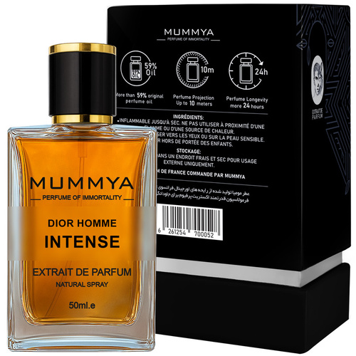 عطر اکستریت پرفیوم دیور هوم اینتنس(Dior Homme Intense) از برند مومیا یک عطر خاص، لوکس و فوق العاده خوشبو برای آن دسته از آقایان خوش سلیقه و شیک پوش طراحی شده که به عطرهای گرم، چوبی . شیرین علاقمند هستند فرموله شده است. در ساخت عطر دیور هوم اینتنس مومیا برخلاف بسیاری از عطرهای بازار با ترکیبات و اسانس های خالص، باکیفیت و تایید شده در صنعت عطرسازی بین المللی با دوزهای بالا حتی قوی تر از ادو پرفیوم و با نام تجاری اکستریت پرفیوم (Extrait de Parfum) با 45 الی 70% اسانس اورجینال بسته به استانداردهای فصل تولید و نت های بویایی تولید شده است. لذا تجربه پخش بو و ماندگاری عطر دیور هوم اینتنس مومیا فراتر از عطرهای مشابهی که قبلا تجربه کرده اید خواهد بود. در کنار پخش بو و ماندگاری بالای این عطر، بسته بندی شیک، لاکچری و طراحی بسیار زیبا آنرا به انتخابی عالی و هوشمندانه برای هدیه به خود و دیگران مبدل ساخته است. دیور هوم اینتنس عطری استثنایی و جسور است که از همان لحظهی اول با ترکیبی از گل زنبق و اسطو خدوس و در نهایت نتهای گیاه مشک مالو، درخت سدر و درخت خس خس با رایحه کهربایی و مشکمانند، قدرت و وقار را به نمایش میگذارد. این عطر با قلبی از وانیل و کهربا، حسی گرم و بسیار لطیف و در عین حال پرشور ایجاد میکند که تا ساعتها روی پوست باقی میماند. رایحهی گرم، چوبی و مشکی آن، مناسب افراد خاصپسند و با اعتماد به نفسیست که دوست دارند متفاوت و فراموشنشدنی باشند. بستهبندی لوکس و نام جسورانهی دیور هوم اینتنس برای کسانیست که از کلیشهها عبور کردهاند. اگر بهدنبال عطری هستید که همه نگاهها را به شما خیره کند دیور هوم اینتنس احتمالا آخرین انتخاب شما خواهد بود. مومیا بصورت تخصصی با فرمولاسیون منحصربفرد همراه با رعایت استانداردهای بین المللی برگرفته از مرغوب ترین ترکیبات و مواد اولیه توانسته در عطر دیور هوم اینتنس به پخش بوی بیش از 5 ساعت، خط بویایی بیش از 10 متر و مانگاری حدود 24 ساعت دست یابد.(موارد مذکور بسته به نوع پوست و جنس لباس شما همچنین فصلی که عطر را استفاده مینمایید متغیر میباشد).