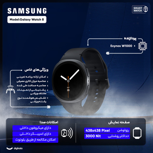 ساعت هوشمند Galaxy Watch 8 جدیدترین نسخه از ساعتهای هوشمند سامسونگ است که با طراحی شیک و وزن سبک 34 گرم در نسخه 44 و 30 گرم در نسخه 40 میلیمتری، تجربه راحت و حرفهای برای کاربران فراهم میکند. این ساعت در دو سایز 44 و 40 میلیمتر عرضه شده که سایز 40 برای خانمها مناسبتر است و مچهای کوچکتر را راحتتر پوشش میدهد. بدنه آلومینیومی و شیشه یاقوتی مقاوم، دوام بالا در برابر خط و خش، ضربه، آب و گرد و غبار را تضمین میکند و بندهای قابل تعویض با چند گزینه مختلف، امکان شخصیسازی و تغییر استایل را فراهم میآورند. صفحه نمایش 1.47 اینچی Super AMOLED با رزولوشن 480 در480 پیکسل و تراکم 327 در نسخه 44 و صفحه نمایش 1.34 اینچی با رزولوشن 438 در 438 پیکسل در نسخه 40 میلیمتری، تصاویر واضح و رنگهای زنده ارائه میدهد. روشنایی 3000 نیت و قابلیت Always-on Display، تجربه راحتی برای مشاهده زمان و اعلانها حتی زیر نور خورشید فراهم میکند. این ساعت یک دستگاه فوق پیشرفته ورزشی است و از تمرینات ورزشی مختلف پشتیبانی میکند و با تشخیص هوشمند نوع رشته، محاسبه کالری مصرفی و مسافت طی شده، ارائه برنامه تمرینی شخصی را ممکن میسازد. سنسورهای سلامتی شامل شمارنده ضربان قلب، سنجش اکسیژن خون، دمای بدن، فشار خون، سنجش سطح استرس، کیفیت خواب و نظارت بر سیکل ماهیانه بانوان، تجربهای کامل از مدیریت سلامت ارائه میدهند. با سیستم عاملWatchOS، پردازنده Exynos W1000 و حافظه داخلی 32 گیگابایت، عملکرد روان و پاسخگویی سریع فراهم میشود. باتری 435 میلیآمپرساعتی در نسخه 44 و باتری 325 میلیآمپرساعتی در نسخه 40 میلیمتر با شارژ بیسیم، برای استفاده روزمره و ورزشی مناسب است. در مجموع، Galaxy Watch 8 ترکیبی از طراحی شیک، عملکرد قوی و امکانات حرفهای ورزشی و سلامتی است که آن را به انتخابی ایدهآل برای کاربران خانم و آقا تبدیل میکند.