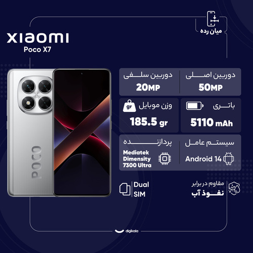 شیائومی Poco X7 در اوایل سال 2025 معرفی شد و به‌سرعت توجه علاقه‌مندان به گوشی‌های میان‌رده قدرتمند را به خود جلب کرد. این دستگاه با طراحی مدرن، قاب جلویی مجهز به شیشه Gorilla Glass Victus 2 و بدنه پشتی با دو نسخه پلاستیکی یا چرم مصنوعی، ترکیبی از زیبایی و دوام را ارائه می‌دهد. از طرفی مقاومت IP68 امنیت بالایی در برابر گردوغبار و آب تضمین می‌کند. نمایشگر 6.67 اینچی AMOLED با پشتیبانی از 68 میلیارد رنگ، نرخ نوسازی 120 هرتز، HDR10+ و دالبی ویژن، تجربه بصری شفاف و روانی فراهم می‌کند. روشنایی حداکثر 3000 نیت و رزولوشن 1220 در 2712 پیکسل، خوانایی و جزئیات بالایی را در هر شرایط نوری تضمین می‌کند. در بخش سخت‌افزار، پردازنده بسیار بهینه Mediatek Dimensity 7300 Ultra با فناوری 4 نانومتری عملکرد روانی در اجرای برنامه‌ها و بازی‌ها ارائه می‌دهد. سیستم‌عامل اندروید 14 با رابط کاربری HyperOS، تجربه‌ای مدرن و قابل شخصی‌سازی در اختیار کاربر قرار می‌دهد. دوربین اصلی سه‌گانه شامل سنسور 50 مگاپیکسلی با لرزشگیر اپتیکال، سنسور فوق عریض 8 مگاپیکسلی و ماکرو 2 مگاپیکسلی، کیفیت مطلوبی در عکاسی و فیلم‌برداری 4K ارائه می‌دهد. دوربین سلفی 20 مگاپیکسلی نیز برای ثبت لحظات شخصی ایده‌آل است. باتری 5110 میلی‌آمپرساعتی با شارژ سریع 45 واتی، امکان شارژ کامل در حدود 52 دقیقه را فراهم می‌کند. مجموعه امکانات ارتباطی ازجمله وای‌فای 6، بلوتوث 5.4، NFC و پورت مادون قرمز، Poco X7 را به گزینه‌ای کامل و ارزشمند در بازار میان‌رده‌ها تبدیل کرده است.