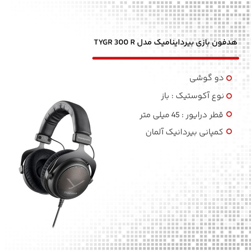 هدفون مدل TYGR 300 R یک هدفون بی نظیر پشتباز چندمنظوره از کمپانی بیرداینامیک آلمان است که صدایی حرفهای و واقعی را با تکیه بر فناوری های پیشرفته و مواد بکارگرفته شده جدید و مرغوب برای کاربر به ارمغان آورده است. کمپانی بیرداینامیک که سابقه بلندمدت در تولید و ساخت هدفون های رده بالای حرفه دارد، طراحی این هدفون را با شخصیت صدای بیرداینامیک برای تاکید بر تجربه ای چشمگیر در صدایی متعادل، زنده و فضایی با آکوستیک نواورانه قرار داده است. فرکانس های بالا بسیار دقیق می باشند، آنچنان که هیچ جزئیاتی از بین نرفته و به هیچ وجه زدگی صدای تیز باعث اذیت گوش نمی شود. ساختار قدرتمند، سبک و راحت، برای استفاده طولانی مدت از این هدفون، آنرا انتخابی ایده آل برای گوش دادن به موسیقی و فراتر از آن تضمینی برای گیمرهای حرفه ای که ریتم بازی و meta pick را خود مشخص میکنند می باشد. هدفون های کمپانی بیرداینامیک آلمان دارای قطعات یدکی و ضروری مانند ایرپد، کابل و کپسول می باشند که از طریق نمایندگی رسمی خدمات بعد از فروش قابل تامین هستند