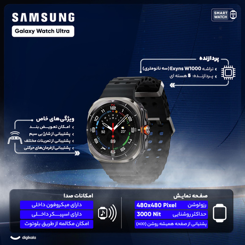 ساعت هوشمند سامسونگ مدل Galaxy Watch Ultra دارای قابلیت های کنترل موسیقی (Music Player)، قابلیت مکالمه از طریق بلوتوث، قابلیت تغ