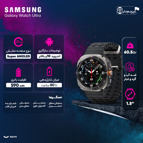 ساعت هوشمند سامسونگ مدل Galaxy Watch Ultra، یک گزینه ایدهآل برای کسانی است که به دنبال ترکیب کارایی و زیبایی در ساعت هوشمند خود هستند. این ساعت با طراحی شیک و مقاوم، بهویژه برای آقایان و بانوانی که از آن در شرایط مختلف استفاده میکنند، مناسب است. ابعاد قاب این ساعت 47.4×47.1×12.1 میلیمتر است و با وزن 60.5 گرم، بهراحتی روی مچ قرار میگیرد. فریم ساعت از جنس تیتانیوم ساختهشده که دوام بالایی دارد، درحالیکه بخش پشتی آن از سرامیک و شیشه سافایر ساختهشده تا مقاومت بیشتری در برابر خطوخش داشته باشد. این ساعت هوشمند دارای صفحهنمایش 1.5 اینچی Super AMOLED با رزولوشن 480×480 پیکسل است که تصاویری شفاف و رنگهای زندهای را نمایش میدهد. از ویژگیهای برجسته این صفحهنمایش، پشتیبانی از حالت همیشه روشن (Always on display) و حداکثر روشنایی 3000 نیت است که امکان مشاهده راحت صفحه در زیر نور مستقیم خورشید را فراهم میکند. Galaxy Watch Ultra مجهز به حسگرهای متعددی مانند سنجش ضربان قلب، سنجش اکسیژن خون، فشارسنج، شتابسنج، قطبنما و ژیروسکوپ است که امکان رصد دقیق وضعیت سلامت و فعالیتهای ورزشی شما را فراهم میآورد. همچنین، این ساعت از GPS برای مکانیابی دقیق و سیستمعامل WatchOS بهره میبرد و با سیستمعاملهای اندروید 10 و بالاتر سازگار است. با باتری 590 میلیآمپر ساعتی و قابلیت شارژ بیسیم، ساعت هوشمند سامسونگ مدل Galaxy Watch Ultra میتواند عملکرد طولانیمدت را در اختیار شما قرار دهد. همچنین، گواهی IP68 و استاندارد نظامی MIL-STD-810H این ساعت را مقاوم در برابر گردوغبار و آب تا عمق 100 متر و فشار 10 اتمسفر میکند، بنابراین میتوانید از آن در شرایط سخت و محیطهای مرطوب هم استفاده کنید.